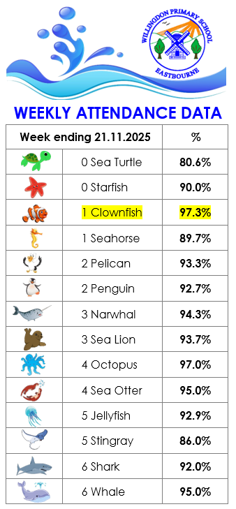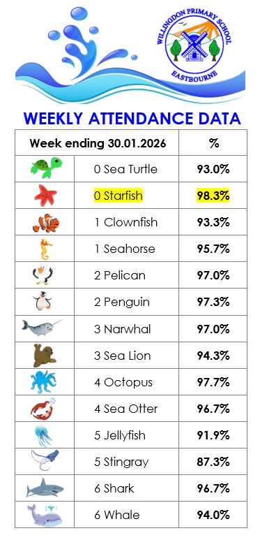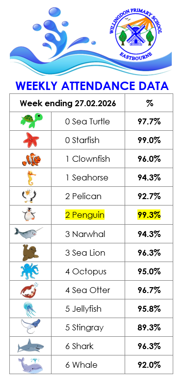 We are very proud of our good attendance at Willingdon Primary School and we always strive to reach our aspiring whole school targets set at 97%.