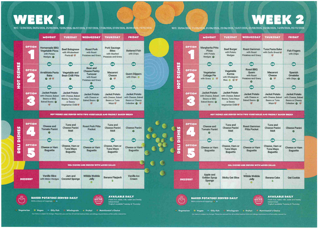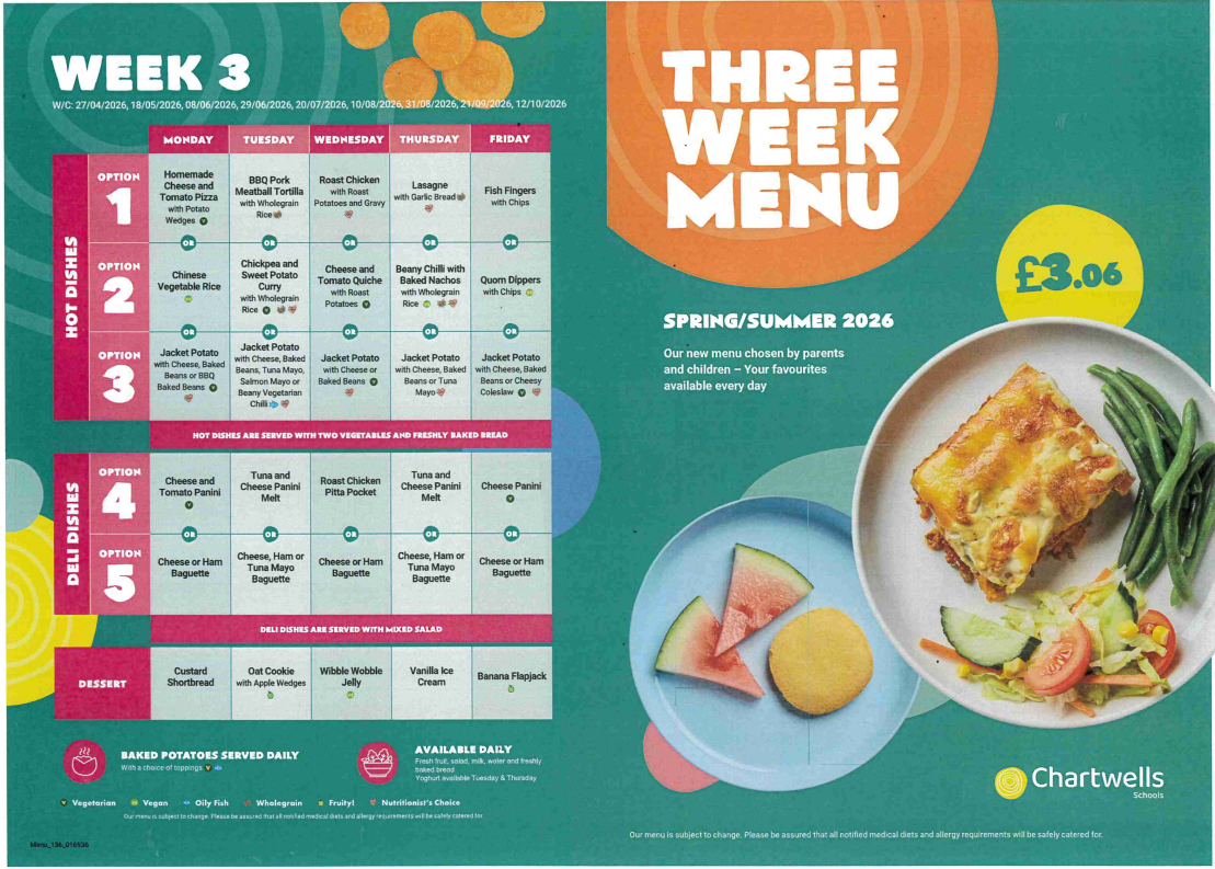 School meals have very strict guidelines on their nutritional content and these guidelines are met by all food served to our children. Chartwells provide a 2-course meal with bread and a drink of milk or water depending upon the child’s preference. There is a vegetarian option as well as jacket potatoes. Fresh fruit will also be offered as an alternative to the pudding.