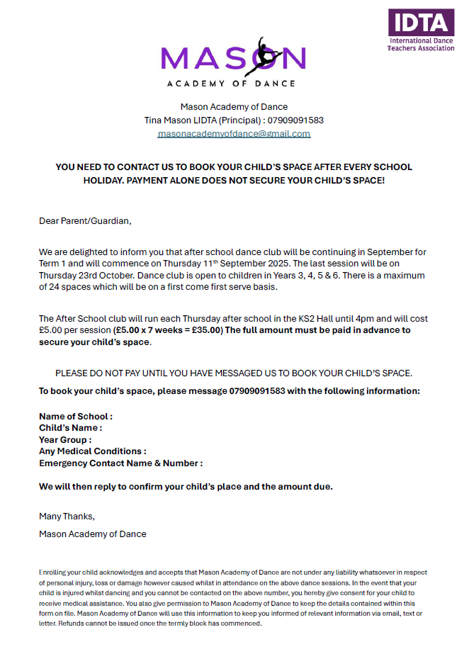 We are also pleased to offer privately operated clubs where outside experts are available to teach your children activities such as Drawing, Karate, Dance and Football. There is a charge for privately operated clubs. All other clubs are run by our teachers for which there will be a small nominal charge each term to cover the cost of resources.