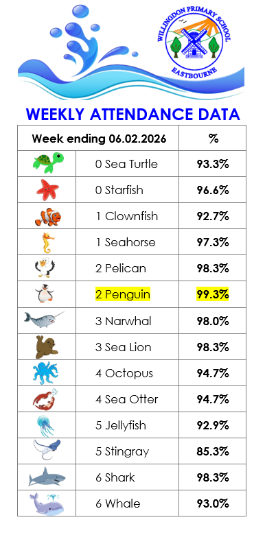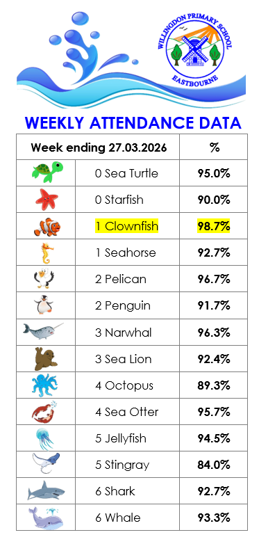 We are very proud of our good attendance at Willingdon Primary School and we always strive to reach our aspiring whole school targets set at 97%.